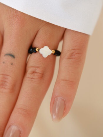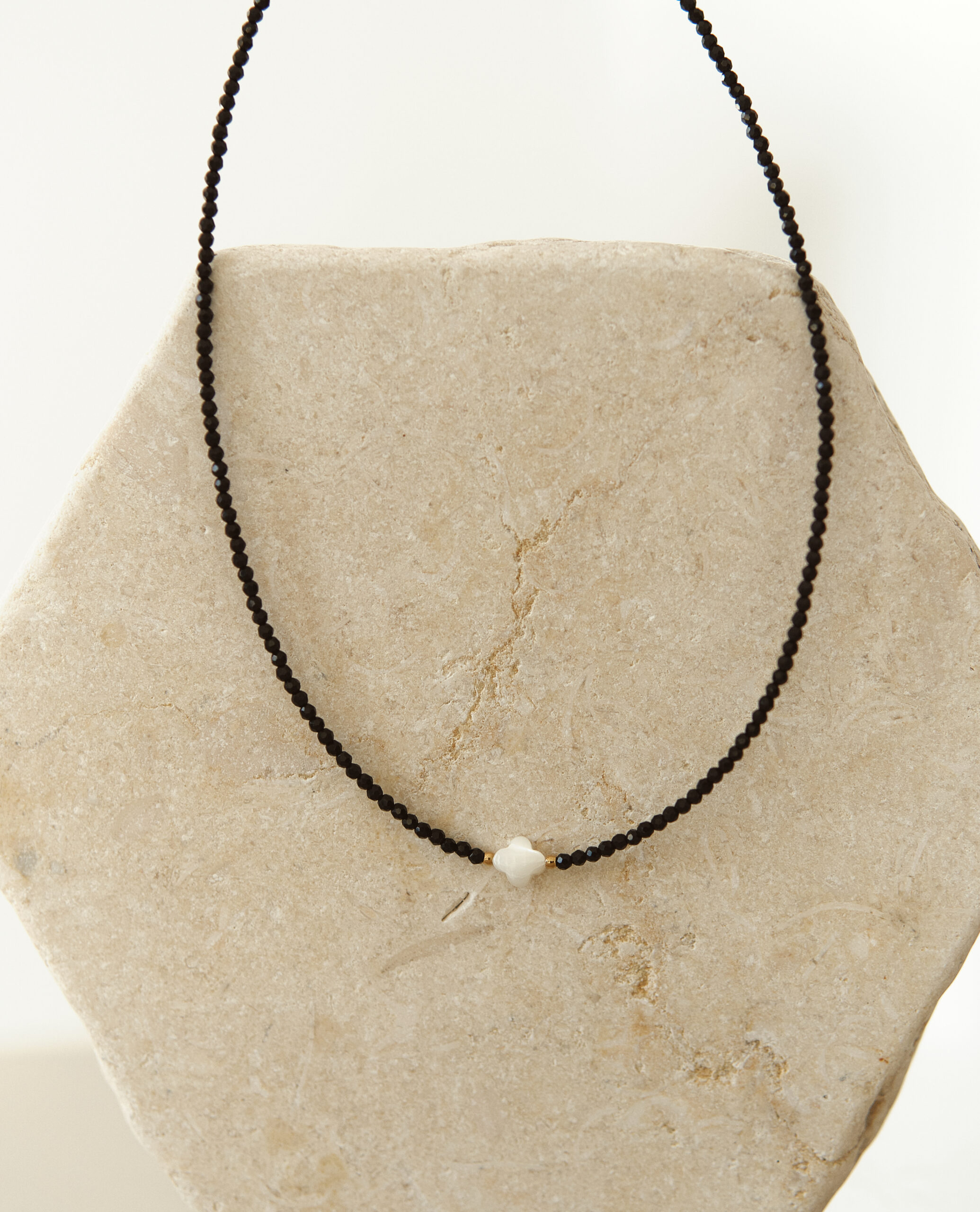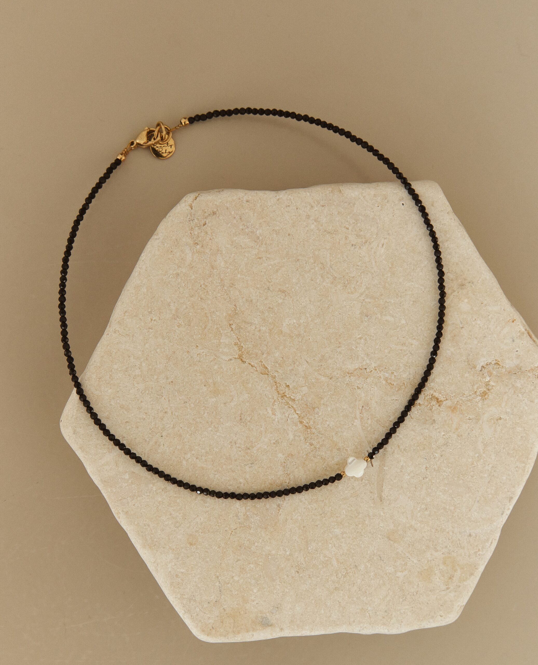 Perleťový detail: Biely kvietok v strede je vyrobený z prírodnej perlete. Jeho jemné odlesky vytvárajú dokonalý protipól k tmavému onyxu.