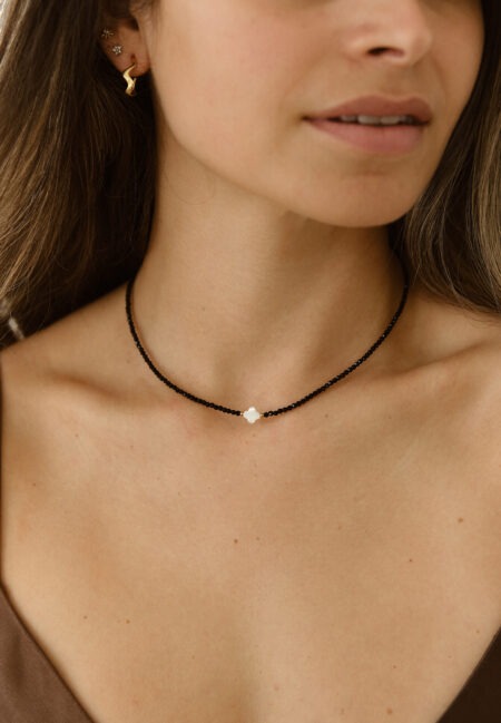 Prírodný Onyx: Čierne minerálne koráliky pôsobia luxusne a hlboko. Onyx je známy ako kameň sily, čo dodáva náhrdelníku hlbší význam.